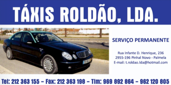 Táxis Roldão, Lda Serviços / Roteiro Empresarial Check all listings by this user Contact details Rua Infante D. Henrique,236Setubal,2955-196 Pinhal Novo - Palmela 212363155 Fax: 212363198 Tlm: 969892884 - 962120805 t.roldao.lda@hotmail.com Facebook Twitter Google+